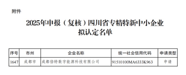 倍特?cái)?shù)能獲四川省專(zhuān)精特新中小企業(yè)認(rèn)定